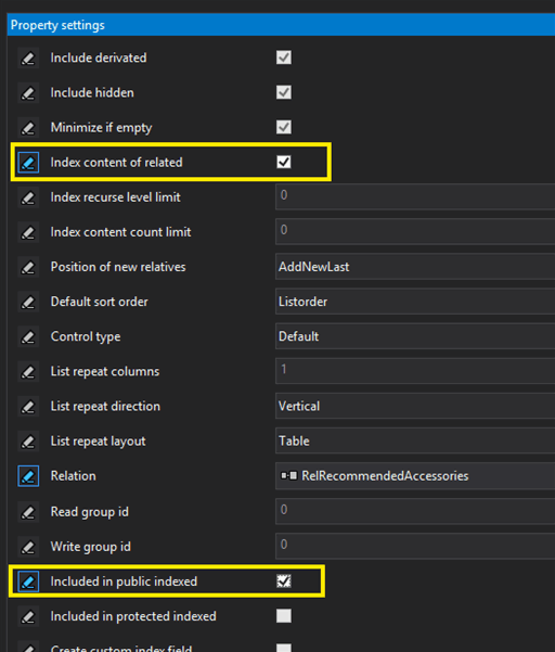 To enable indexing of related content, you must turn on a setting that only exists on a relation property: “Index content of related”. Make sure that the “Include in public index” setting is enabled and checked.