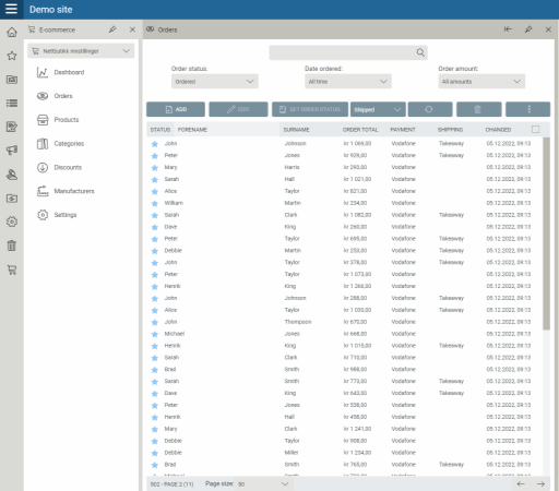 The Orders tab is one of the most used tabs, as all orders are normally handled here. The most common action here is to change the order status of orders to "Shipped" as the products in the orders are packed and sent to the shipping company.