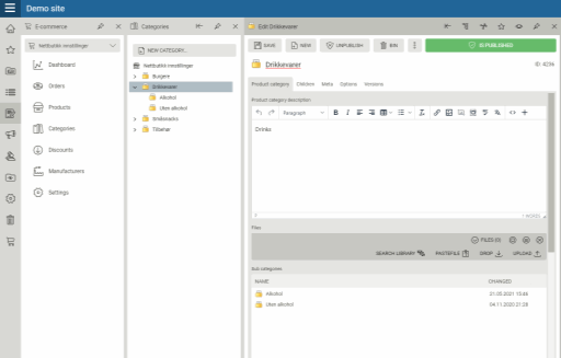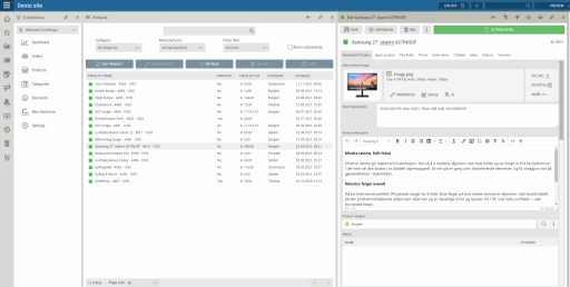 The products tab lists all the products in the shop. A product in the shop has to be of a type of ProductBase, or a content class that inherits from ProductBase. If you double-click a product, a dialogue window will open, where you can edit the product in question.